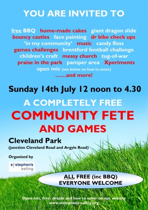 This is the second year of this event organised by St Stephens Church. It will be on Sunday July 14th 2013 from 12 noon to 16.30 at Cleveland Park (junction Cleveland Road and Argyle Road in West Ealing) and is a family event with all activities including BBQ and refreshments COMPLETELY FREE. There will be music - steel band, blues, folk and contributions from youth including the Ealing Battle of the Bands winner. In addition there will be an Open Mic opportunity aimed mainly at young people, but not exclusively so