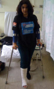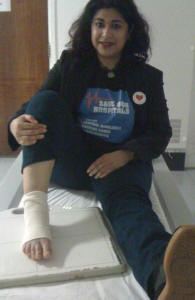 Branch secretary & Women's Officer for Ealing Labour group, Dr. Aysha Raza, is a staunch supporter of Ealing Hospital. Dr. Aysha Raza is at home, with her feet up, watching the telly. This is not to be mistaken for laziness; Aysha is a qualified neuroscientist working in research at University College London. She keeps her right foot raised as a medical precaution after fracturing her foot in the last march against the closure of Ealing Hospital’s A&E unit. On Saturday 27th April, Ealing borough residents came together to rally and protest against the A&E and maternity services closures for Charing Cross, Hammersmith, Ealing and Central Middlesex Hospitals. Council members from all parties have banded together to support the ‘Save Our Hospitals’ campaign, headed by Dr. Onkar Sahota and backed by Council Leader, Julian Bell. Dr. Raza was making placards and signs the night before the march. On the day, her role was to assist with traffic control. “We had just gone past Ealing Hospital and there were so many people – we had pensioners, parents, students, people using motorised mobility units and people from outside London. “I was with MP Steve Pound, and we were keeping the atmosphere light while stopping and starting the crowds, to avoid congestion. “There were double-decker buses coming on the opposite side. I was instructing straying people away from the other lane, so I was walking backwards to make sure that no-one was compromised.” Unfortunately, she tripped trying to avoiding a child who had appeared from no where. “This child breaks away from main march and stands behind me. Next thing I know, I’m on the floor with shooting pains, and – what I thought was – a twisted ankle. “There were hundreds of people still coming towards us so I needed to get out of the way. Thankfully, Steve (Pound) and Councillor Ranjit Dheer were by my side. “I asked them to get me up and I continued walking using my GMB Trade Union flag as a walking stick – I was determined to keep going – I guess you don’t realise how much pain you’re in when you’re on adrenaline.” As the protest got to Ealing Common to the final rally, Dr. Raza discovered the extent of her injuries. “I got on the grass and put my foot up. MP Steve Pound got me a 99p flake and called me a ‘brave soldier’. “When I discovered I couldn’t walk after this, Dr. Sahota and Steve carried me to nearest pub, and then I arranged travel home.” A family member’s operation drew Dr. Aysha to Ealing Hospital on the next day. Her uncle was scheduled for bypass surgery and she was there to comfort him. Thinking she had only sprained her ankle, she decided she would just have to cope with her injury. “It was during the week, while I was with my uncle, my foot had gone from purple to green to yellow, and the pain was getting worse. “I went to the A&E to ask them to check if it was just a sprain. I was happy to be seen within two and a half hours, going through triage, X-ray and then to a specialist doctor. “It turned out to be a cuboid bone fracture – apparently it’s an awkwardly positioned bone and therefore quite rare to damage – and I was put in a cast and given medication.” She has praised the work of the Ealing Hospital team, not only for herself in A&E, but for level of care given to her uncle, calling it ‘excellent and wonderful’. “I can get to Ealing Hospital in five minutes on a bus and this has helped me enormously. It would have been so difficult if what they’re proposing happens. The nearest hospitals would be St. Mary’s or Hillingdon hospital. “For Ealing, it’s an absolute lifeline. Being a scientist, I like to think logically and I sat through the public meetings thinking that the government proposals don’t make sense.” When asked if she would still be attending the protest from Waterloo to Downing Street, she was adamant: “I’ll be attending – I will definitely be there – it’s far too important not to be. I’ll be there in a wheelchair if I have to.”