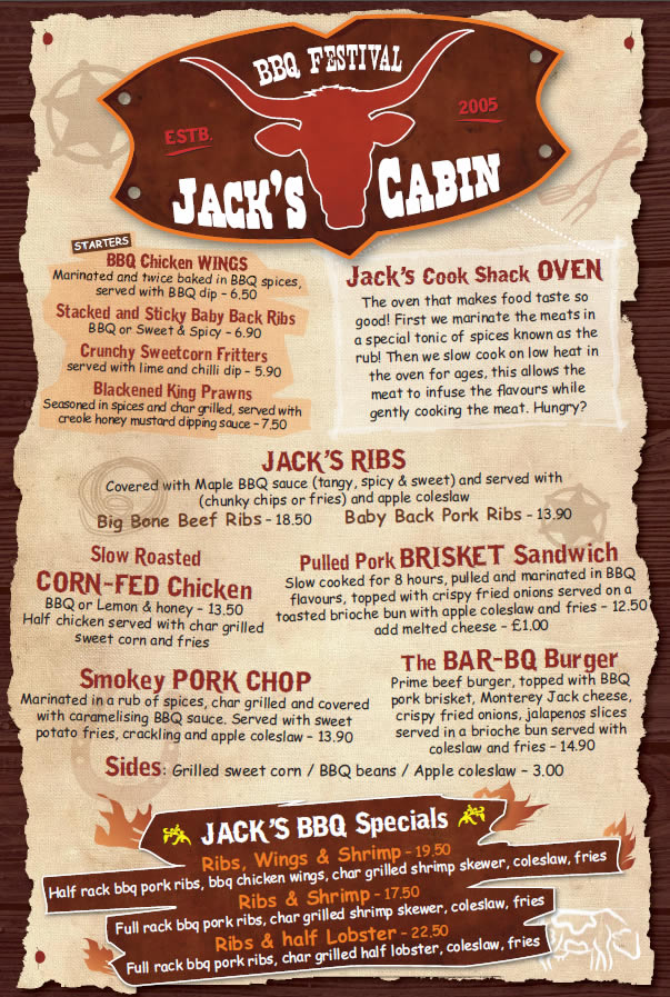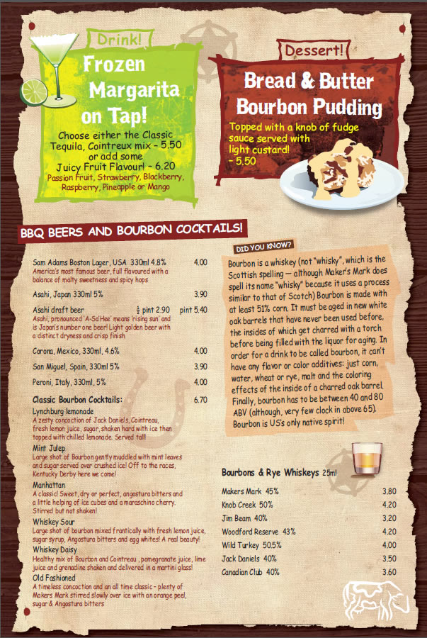 Choose from among Jack's Ribs, Smokey Pork Chop, Slow Roasted Corn Fed Chicken or Pulled Pork Brisket Sandwich and then why not try one of our BBQ beers or Bourbon cocktails to accompany them? And don't forget the Bread & Butter Bourbon Pudding topped with a knob of fudge sauce served with light custard.